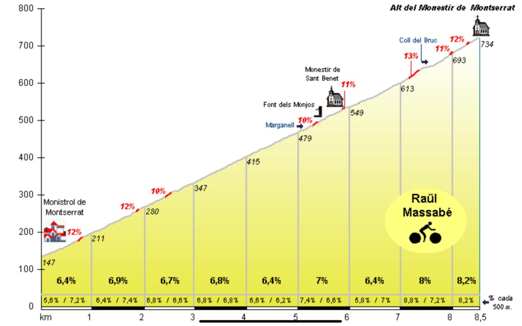 Así pues, Montserrat sería el puerto. 8,5km al 6,7% por lo que con 16 subidas se completa el reto. Cabía la opción de hacer la subida más corta, o bien hasta el avituallamiento de Sant Benet en el km 6 o hasta la barrera del parking km 7,3, pero decidí que pese al tráfico había que subir 16 veces a visitar a la Moreneta, que siempre nos está cuidando. Si se sube, se va hasta arriba. Bueno, hasta donde empieza el llano, que lo otro es peatonal y ya lo haríamos en la última.