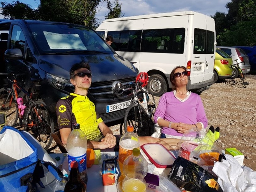 Desayuno fuerte, reviso que no falte nada de lo que dejé en la furgoneta el día anterior y cargo la comida y bebida que tomaré durante el día. Marc, otro hijo mío, me acompaña ya desde el principio, y lleva también su bicicleta para acompañarme en alguna subida.