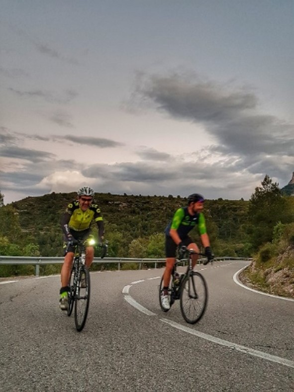 El final se ve cerca y el subidón es total. Ya solo quedan dos. Se hace de noche y volvemos a colocar los focos en la bici. Para esas dos últimas subidas, me pongo geles en el bolsillo y tomaré uno a mitad de cada subida, porque ya no queda energía en ninguna parte del cuerpo. La subida 15 la hacemos bastante bien, con prudencia de no cebarme, ya que, aunque solo quedan 2 y parece poco respecto a 16, son 2 subidas al puerto de Montserrat que las afronto en unas condiciones límites.